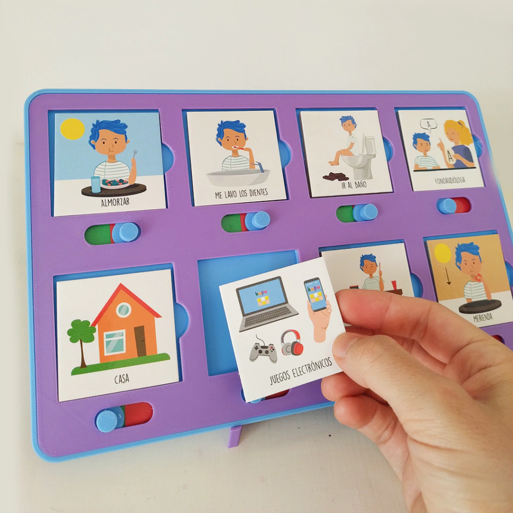 Esta Agenda Visual de Rutinas diarias contiene: 32 pictogramas imantados de 5x5 cm, 3 mm de espesor y laminados: cenar, almorzar, desayuno, merienda, dormir, despertarse, escuela/jardín, doctor, fonoaudióloga, psicopedagoga, T.O., me lavo las manos, casa, me baño, juegos electrónicos, juguetes/juegos de mesa, ir al baño, compras, plaza, dentista, trabajo/estudio, leer, música, deporte/ejercicio, me lavo los dientes, jugamos con amigos, cine, paseo en auto, ahora, después, cumpleaños, psicóloga. Además contiene los 7 días de la semana en 6x2 cm.