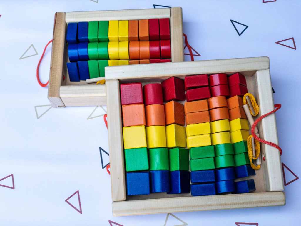 Contiene: Cajón con 30 piezas de diferentes formas geométricas y colores + dos agujas para enhebrar de madera.