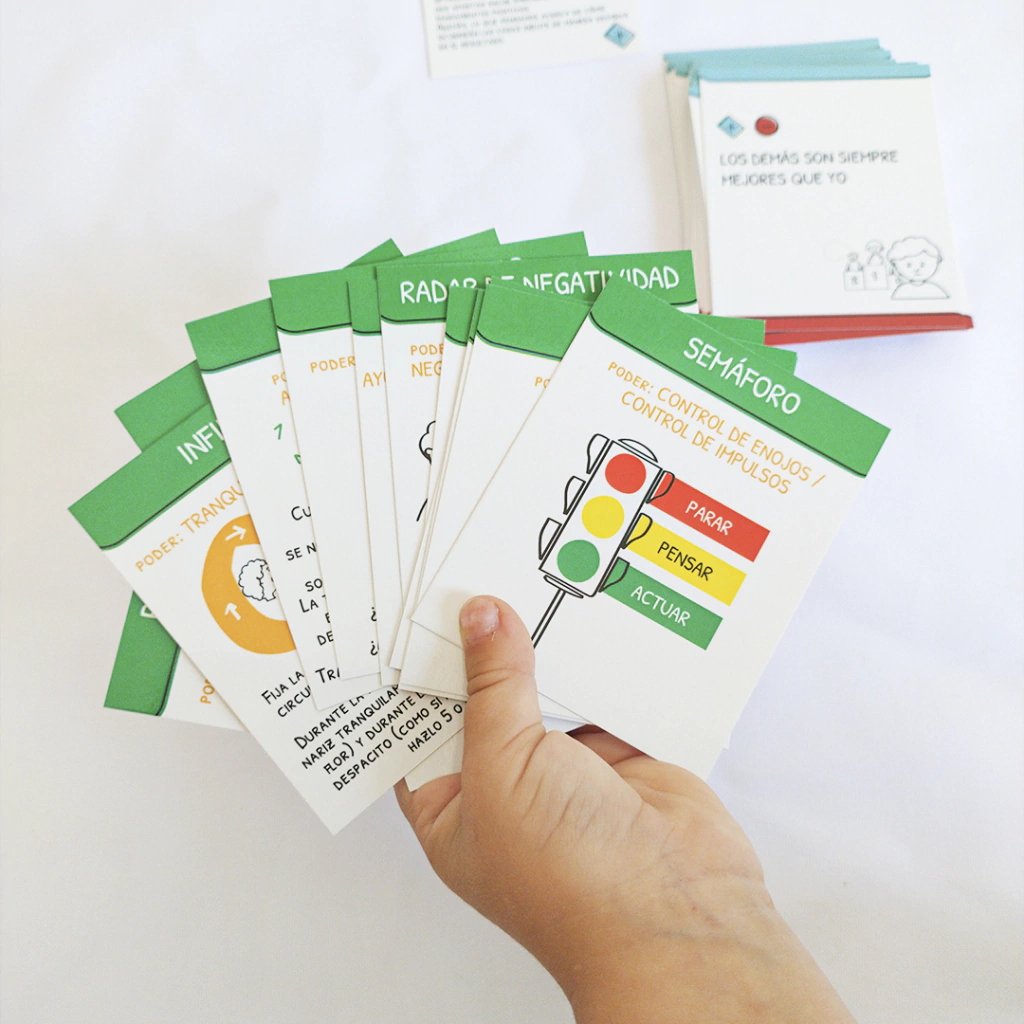 Contenido del material: - 54 cartas de 6 x 8 cm que incluyen pensamientos positivos y negativos. - Herramientas poderosas para el manejo emocional. - Dos fichas: dedo pulgar arriba y dedo pulgar abajo.