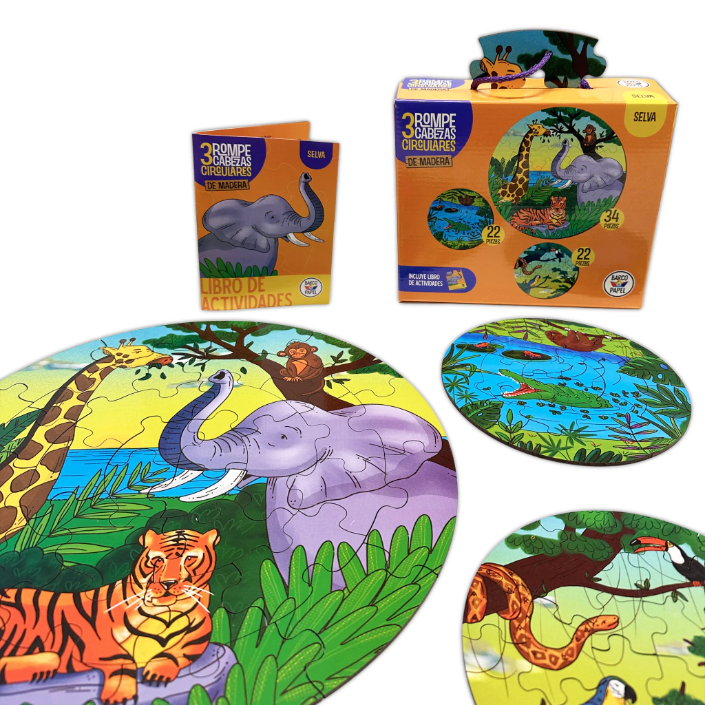 3 Rompecabezas circulares de madera selva.
