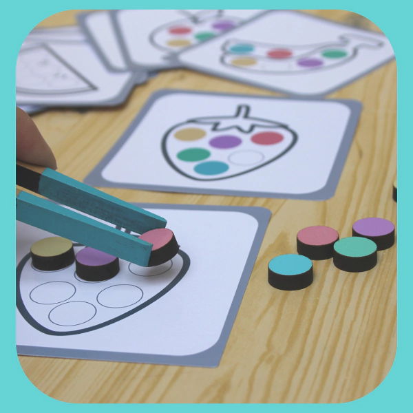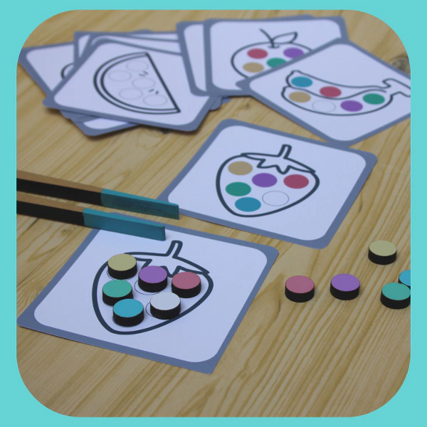 Contenido del producto: - Pinza de madera: ideal para mejorar la motricidad fina. - 12 fichas de colores: perfectas para ejercitar la clasificación y el reconocimiento de colores. - 5 tarjetas de 10 x 10 cm con diferentes patrones de siluetas de frutas: fomentan la creatividad y el aprendizaje visual. - 5 tarjetas con cuadrícula base: ayudan a los niños a organizar sus ideas y trabajar en funciones ejecutivas.